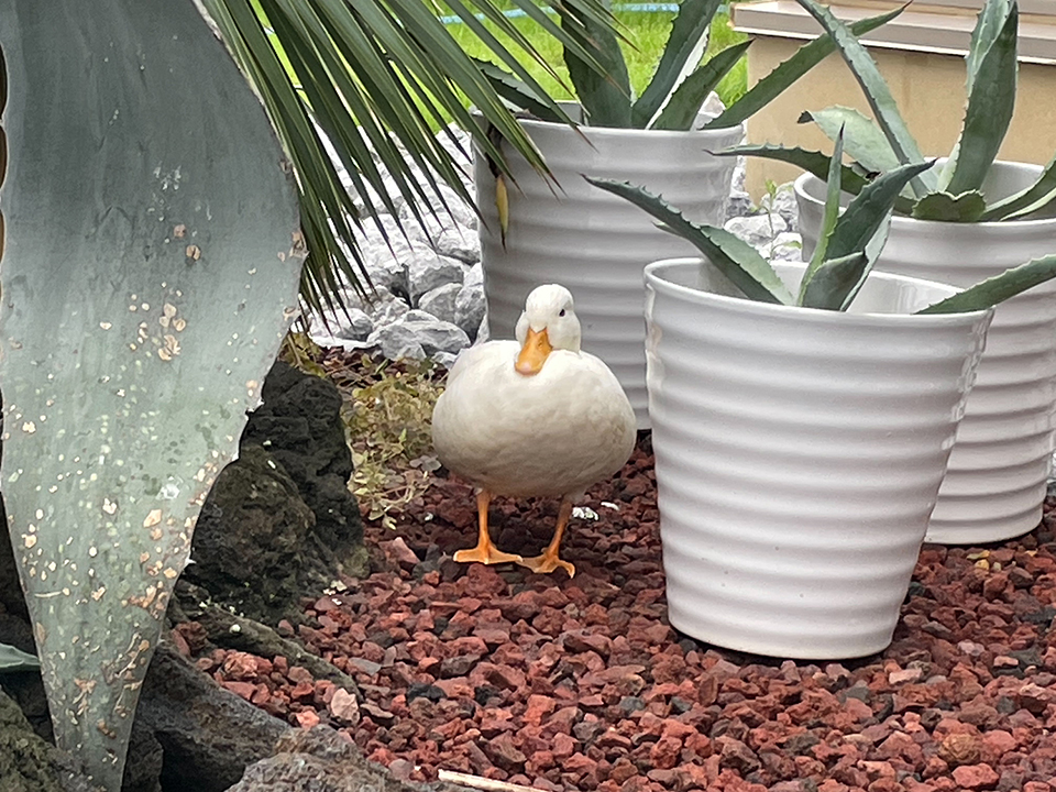 朝から弊社の庭に思いがけないお客様が迷い込んできました。 可愛らしい一羽のアヒルです。